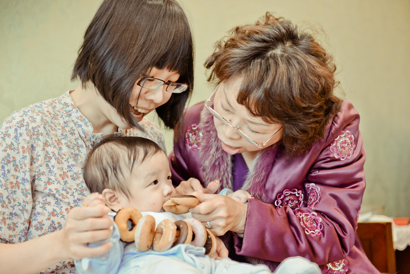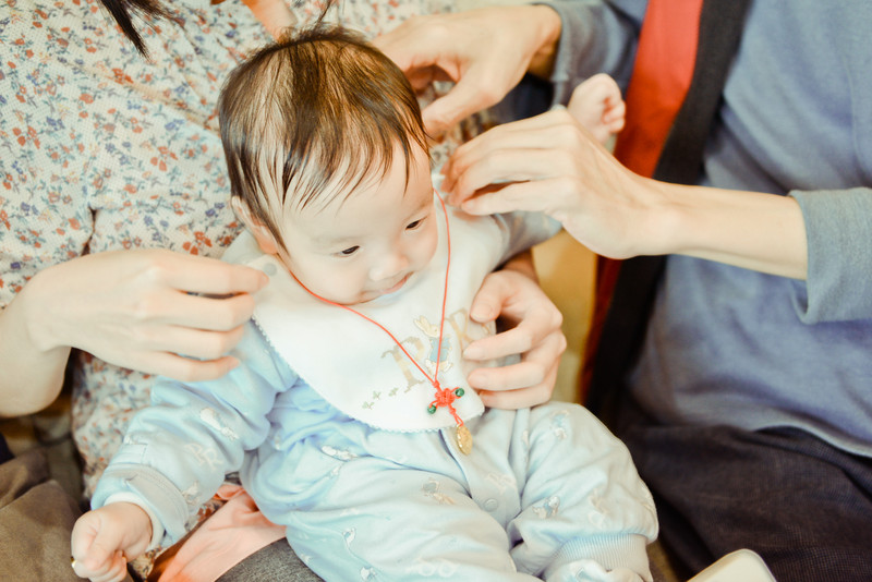 以前的人都用12個或24個酥餅,串上紅線掛在寶寶的脖子上,再請長輩跟親友一人拿一個酥餅,在寶寶嘴唇邊作抹口水狀