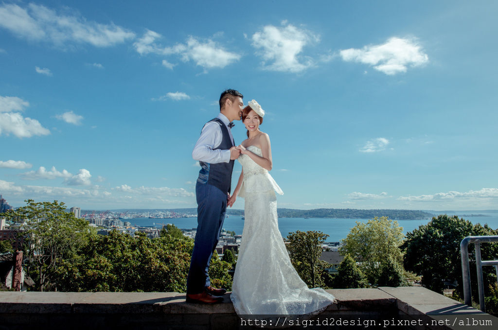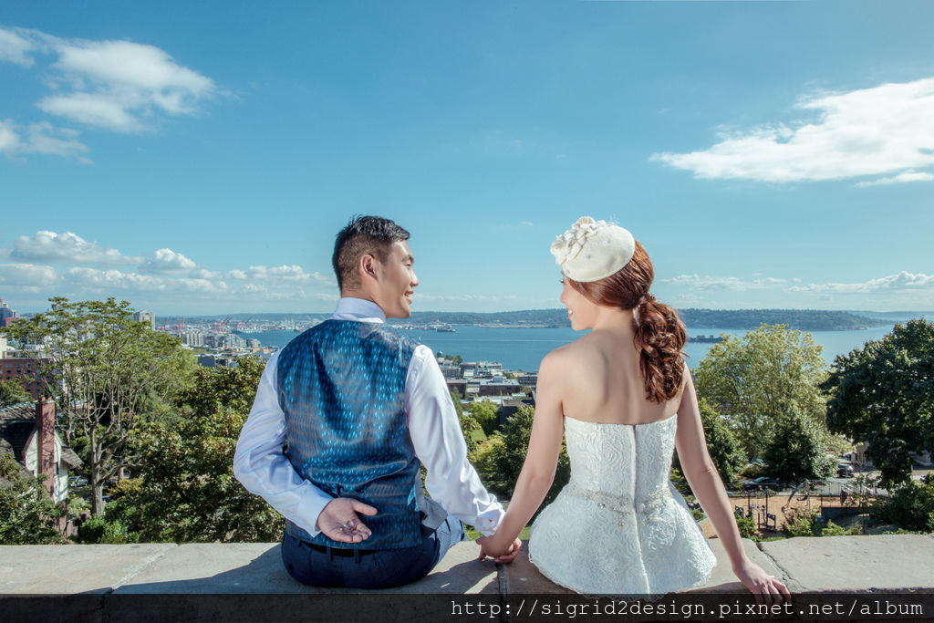選擇了一襲水溶蕾絲白紗搭配優雅白色貝蕾帽,在晴空下與Vincent共同俯瞰西雅圖城市全景