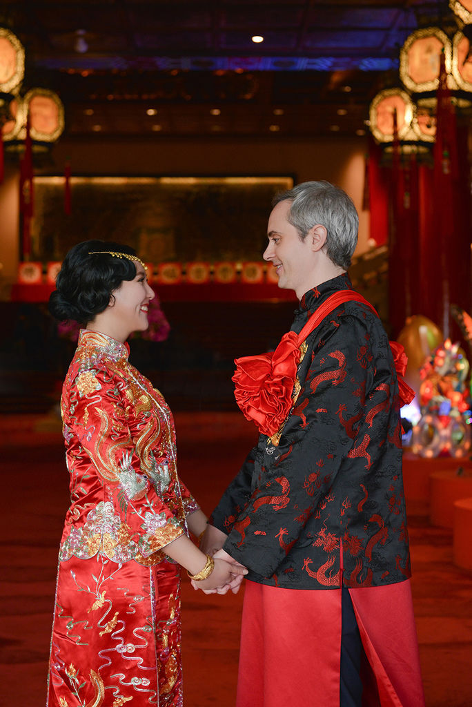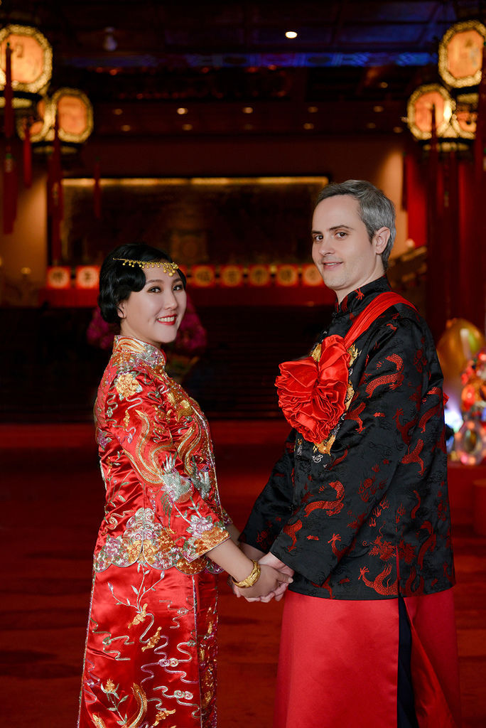 點子很多的美麗新娘Linda特意安排穿著龍鳳掛,整場婚禮夾雜著西班牙文、英文、中文與台語,來自世界各地的親友齊聚圓山