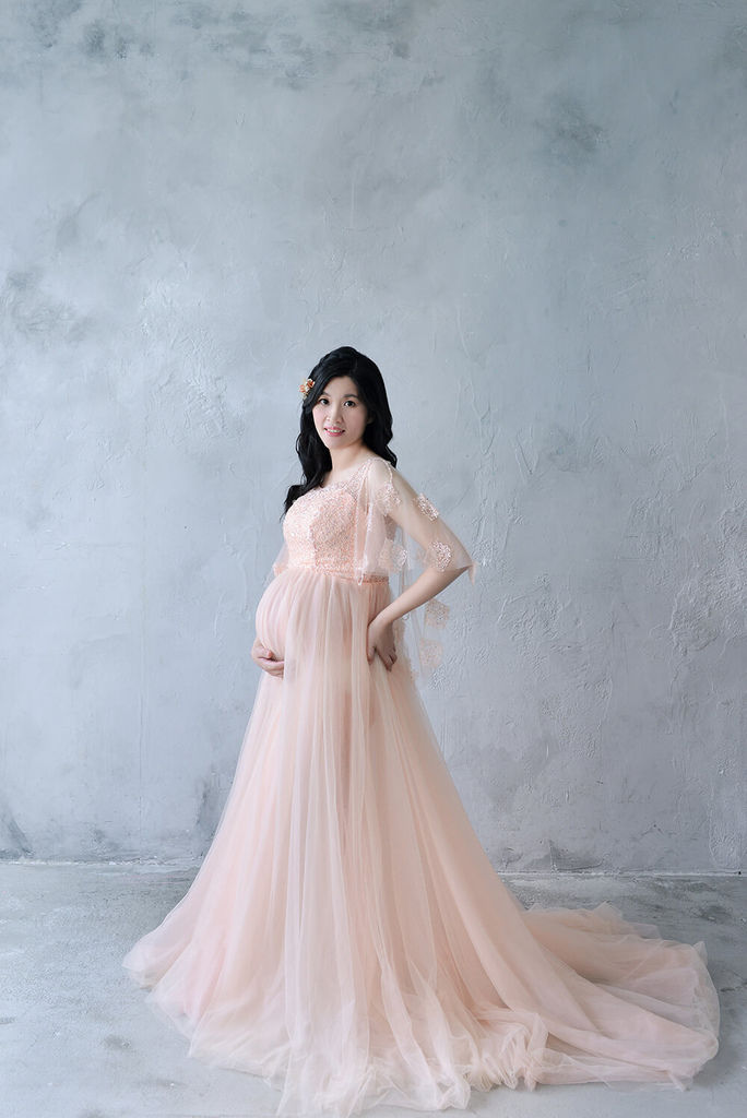 來自新竹的孕媽咪平常是熱愛工作的理工科教授,覺得一襲柔粉色特別適合她