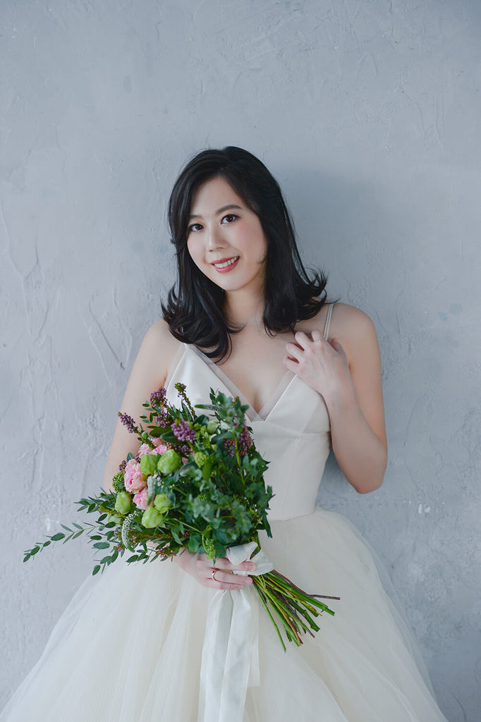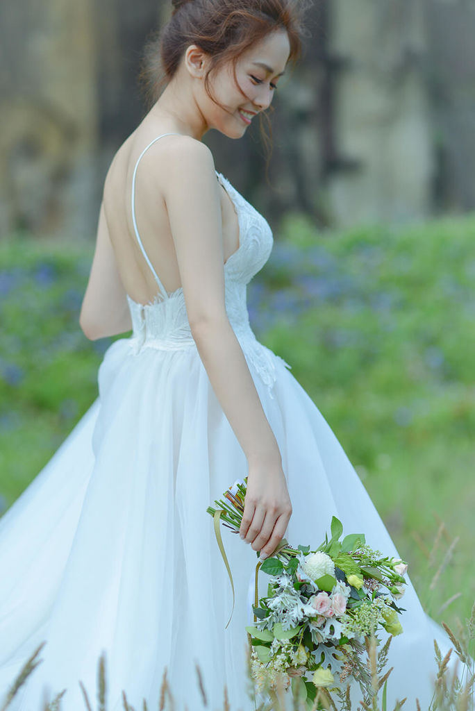 穿著設計師款白紗氣質新娘Amanda與清新雅緻的庭園風格捧花。