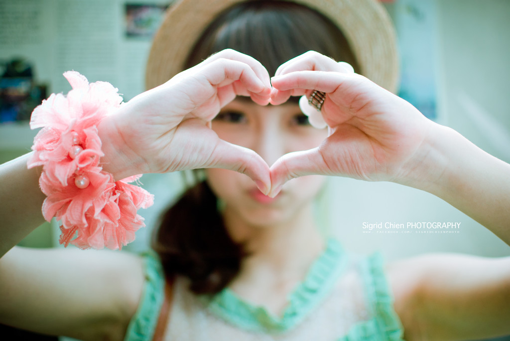 就是將對焦中心對準比出愛心手勢的手,後方溫妮的臉就自然成為背景了。